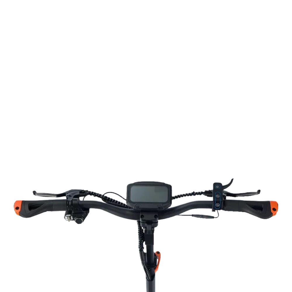 Kugoo F3 Plus рассчитан на нагрузку до 130 кг и покоряет подъёмы с углом до 25°. Широкая дека и руль (685 мм) делают поездку максимально удобной даже на дальние расстояния. Дисплей с бортовым компьютером отображает ключевые показатели: скорость, заряд, пробег.