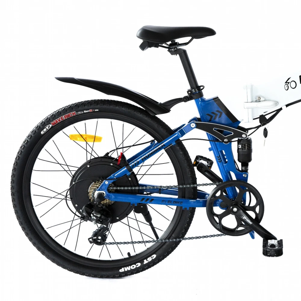 Электровелосипед Elbike HUMMER ELITE 13 Синий – выглядит круто на фоне другой, аналогичной техники. Рама выглядит массивно и современно за счет брендовой надписи и наличия в ней емкой батареи. 26 дюймовые колеса с цепкими покрышками предназначены для езды по бездорожью и другой проблематичной местности. Также техника может использоваться в качестве ежедневного варианта.